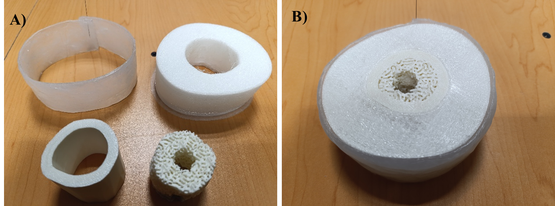 Como resultado del proceso de elaboración, se obtuvo un maniquí compuesto por capas diferenciadas que representan los principales tejidos de una sección transversal del brazo. En la Figura 1, A) se muestran las distintas capas resultantes de la impresión 3D, el componente óseo, correspondiente al húmero, fabricado con material ABS debido a su rigidez y similitud con las propiedades del hueso cortical y trabecular. La capa muscular se imprimió utilizando TPU y la piel que fue replicada con una cubierta de silicón. Cada componente fue impreso por separado, respetando su geometría y grosor específicos, y posteriormente ensamblado de manera manual para formar el prototipo completo mostrado en la Figura 1, B). Este enfoque por capas permitió una integración estructural precisa y un alto grado de realismo en el modelo final.