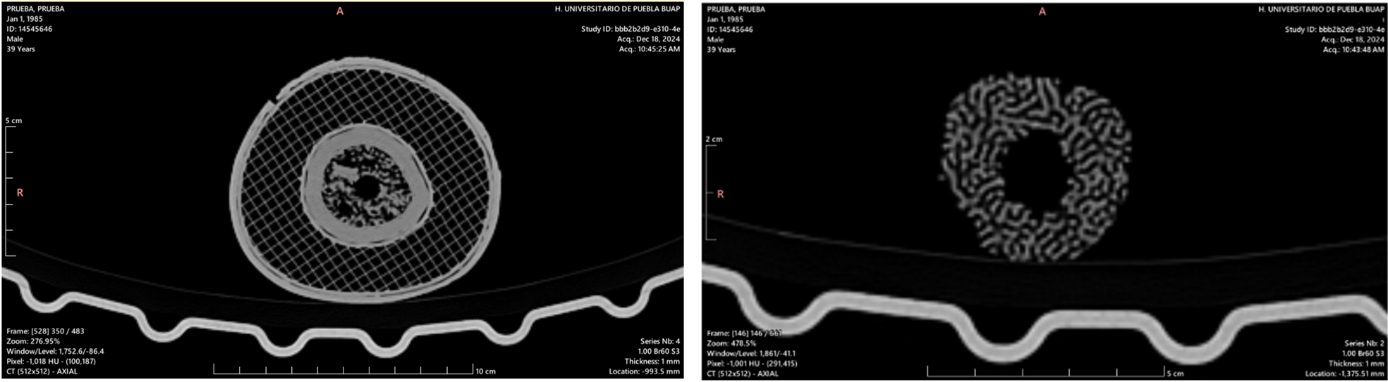 Una vez fabricado el maniquí se dio paso a la fase de validación donde el modelo fue sometido a un estudio mediante tomografía computarizada (CT) clínica. Las imágenes obtenidas se analizaron mediante técnicas de procesamiento digital utilizando transformada de Fourier para la identificación de patrones espaciales y análisis de dimensión fractal para cuantificar la complejidad morfológica. Los resultados se compararon con valores de referencia obtenidos de muestras óseas reales.