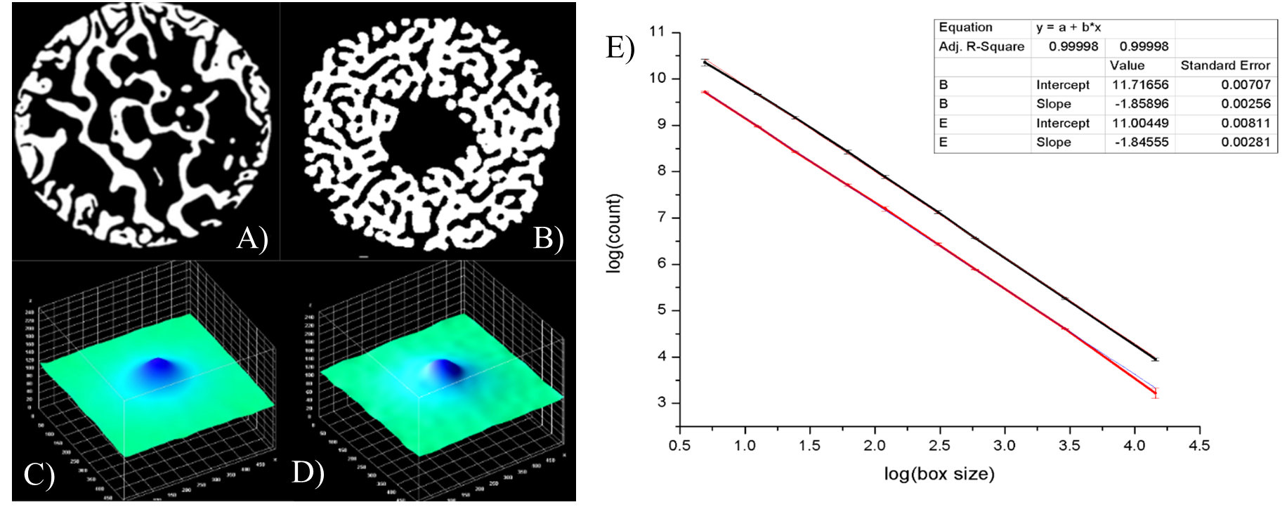 Figura 3: A) Corte transversal del hueso trabecular reflejado por CT, hueso (blanco) y aire (negro); [9], B) corte transversal de la estructura trabecular del maniquí por CT, C-D) Transformadas de Fourier de A) y B) respectivamente, E) Resultado de la dimensión fractal de A) y B) respectivamente